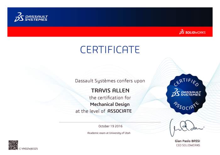 Upon completion of my first mechanical engineering course at the University of Utah in the fall of 2016, I obtained an associate level certification for mechanical design from Dassault Systemes. I scored 240 out of a possible 240 points on the certification test.