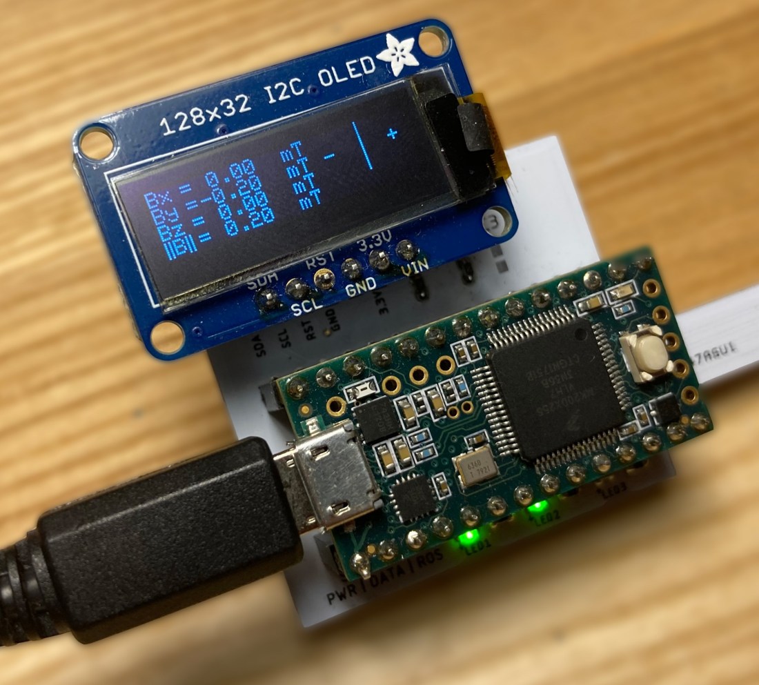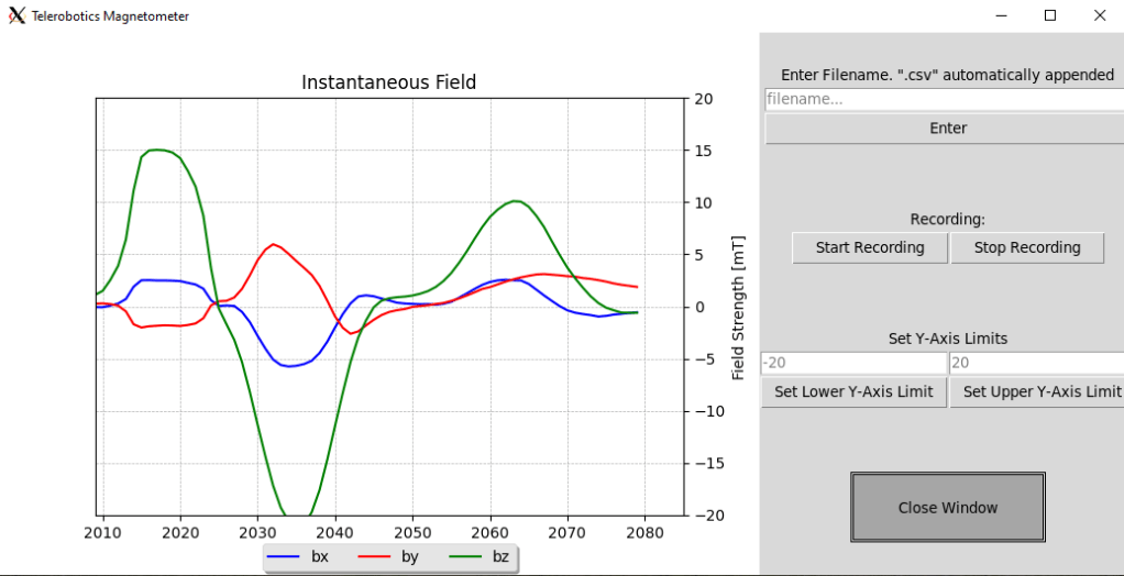 I do a lot of work with magnets at the Utah Telerobotics Lab. Often, I need to take measurements of a local magnetic field, so I use a magnetometer. My lab has a few magentometers, some of which are very accurate and have a small maximum field magnitude reading, and some are less accurate but can measure larger fields. One of these less accurate but more versatile magnetometers is a custom device built by Dominick Ropella at Vanderbilt University. It consists of a Teensy 2.0 microcontroller which is attached to a custom PCB that contains an Infineon TLV439D 3D magnetic sensor. When we received the sensor from Dominick, it used ROS to display and record sensor data. I believe this is because Dominick used this sensor as a pet-project to learn to use ROS, and while that’s fine and good, ROS is fairly cumbersome and has quite a steep learning curve that is unnecessary to contend with if all you want to is do record and visualize data from a sensor. As such, the sensor went unused for a few years because it was simply too annoying to set up to actually get used.