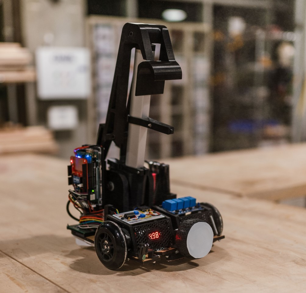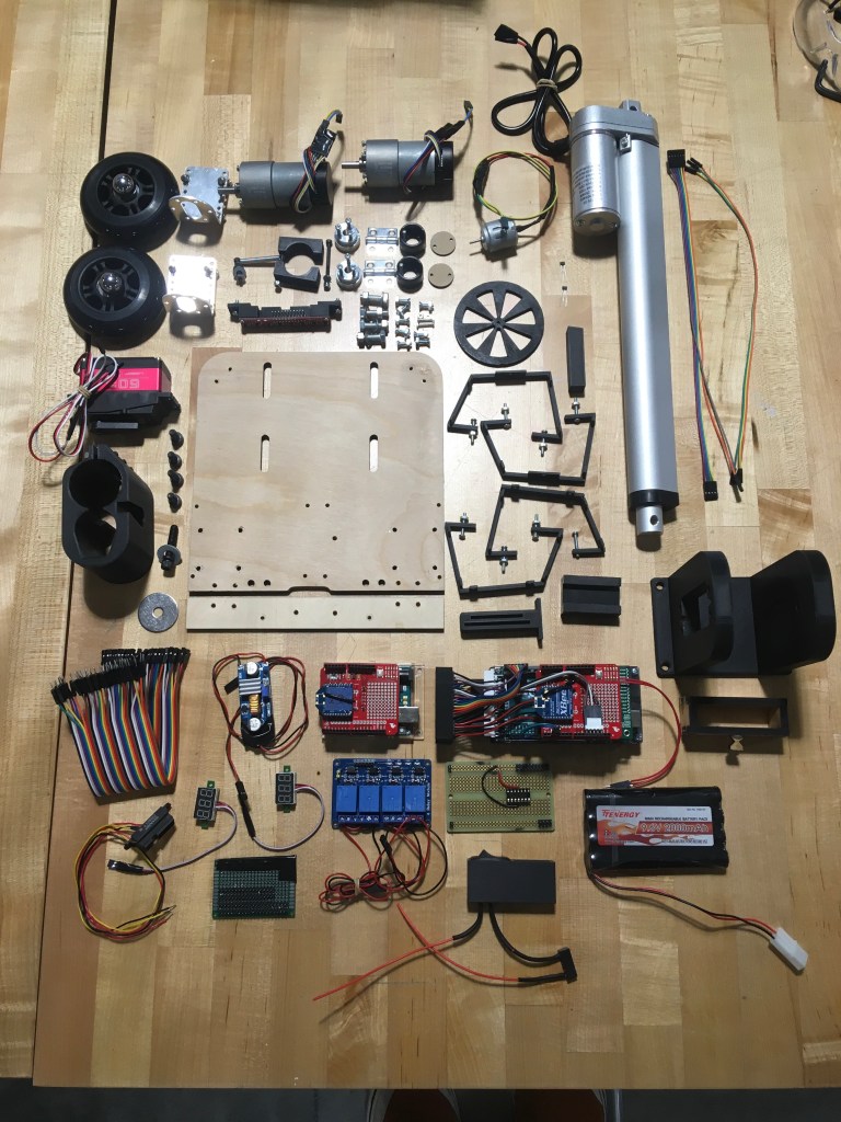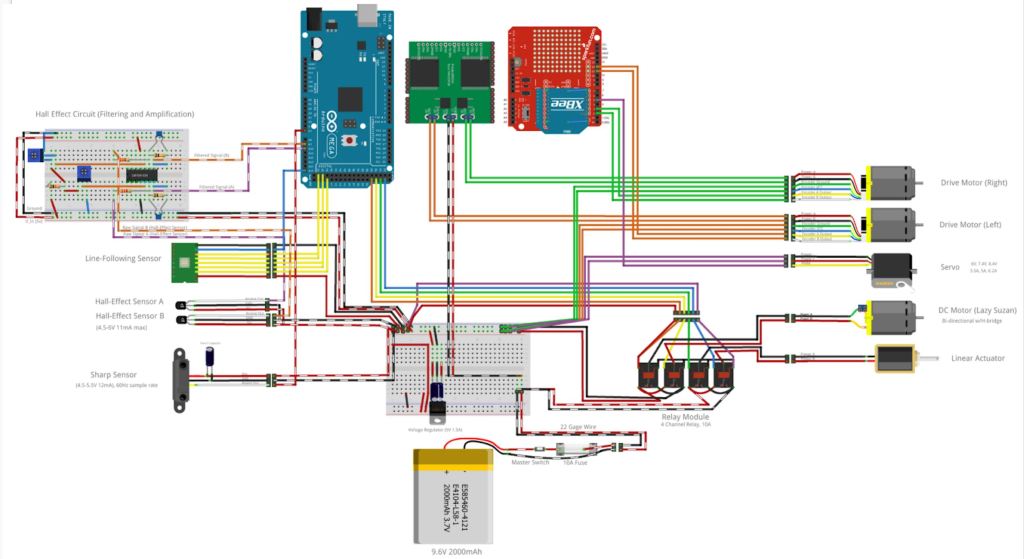The robot is controlled by an Arduino Mega that we programmed. Commands are sent wirelessly from one of our computers to the XBee shield on the arduino. The commands tell the robot to start its routine depending on what obstacle it is placed on. Otherwise, the robot is completely autonomous.