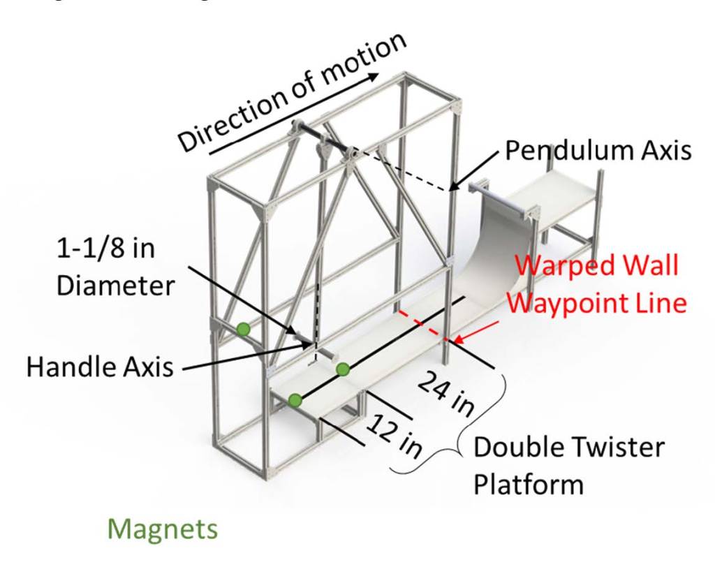 The double twister is a pendulum with two degrees of freedom. The first is the axis that the pendulum swings about. The second is the axis the handle spins around. The two axes are perpendicular to one another. The robot must attach itself to the arm of the swing and descend to the lower portion of the course. The robot must then remove itself from the arm of the swing and continue on the course.
