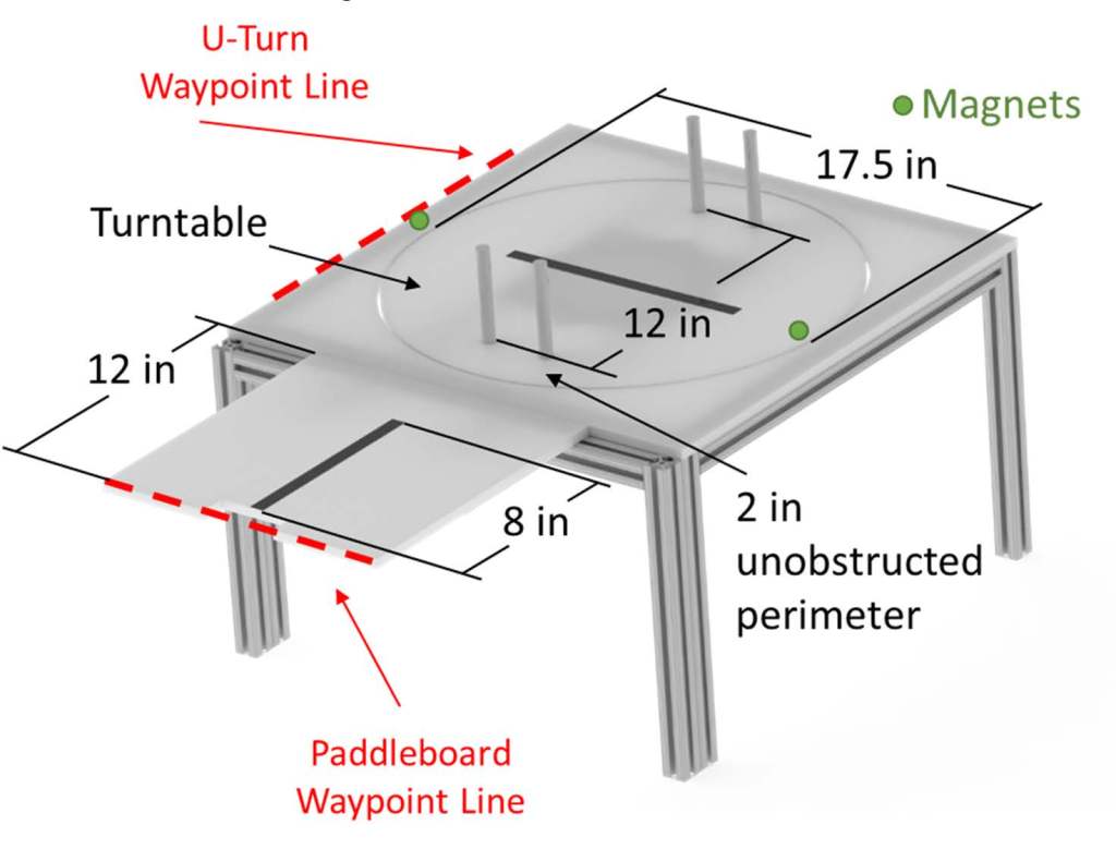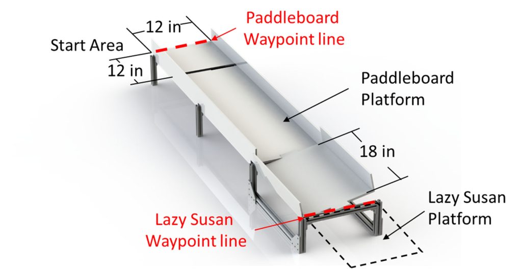 The paddleboard is a flat surface with white walls on either side. It is able to rotate about the center so that if a robot is too close to one side of the paddleboard, the paddleboard will flip over and the robot will fall. A schematic is given below: