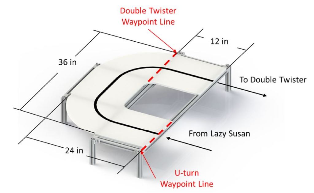 The U-turn is a U-shaped curve in the course. The robot must drive around the curve without falling off on either side. There is a black line in the center of the course.